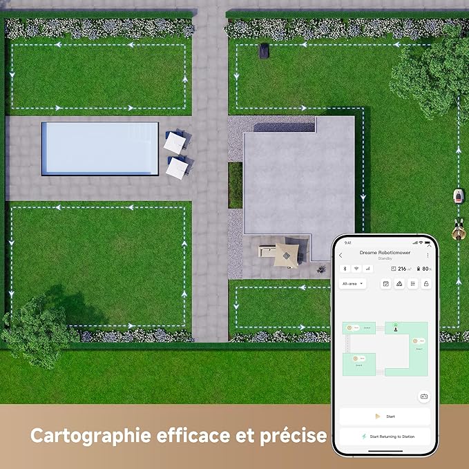 - Gestion intelligente et intuitive des zones: Les routines de tonte sont vraiment simples, vous n’avez plus besoin de surveiller l’ensemble du processus; Les tâches de tonte en temps réel ou planifiées, les zones de tonte ou interdites, ainsi que les zones temporaires ou prédéfinies peuvent toutes être réglées avec l’application Dreamehome