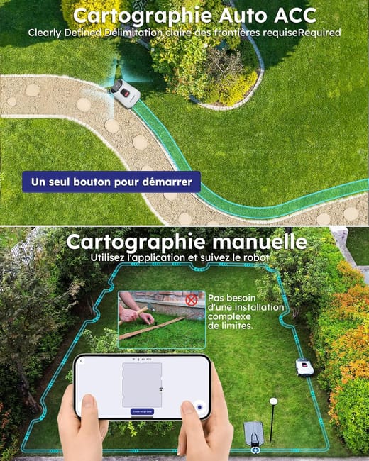 【Sans Fils Périmétriques】Dites adieu aux câbles de délimitation ! Grâce à notre tondeuse robot sans fil, vous bénéficiez d’une solution innovante, sans tracas. Contrairement aux modèles traditionnels nécessitant des câbles périmétriques, notre conception de pointe supprime l’installation complexe. Fini les câbles emmêlés et la configuration fastidieuse : profitez simplement d’un entretien fluide et précis. Parfaite aussi bien pour les débutants que pour les experts, cette tondeuse vous fait économiser du temps et des efforts.
