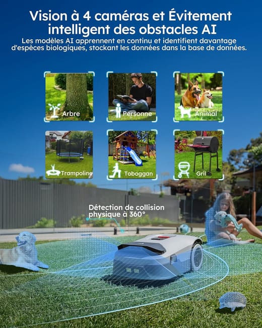 【Évitement d’Obstacles Intelligent】La caméra Genie, avec son champ de vision de 300° et ses algorithmes d’intelligence artificielle intégrés, détecte une large gamme d’objets courants dans le jardin, assurant ainsi un évitement d’obstacles renforcé et une sécurité accrue. Grâce à une détection rapide et précise des situations dangereuses, elle maintient une distance de sécurité vis-à-vis des animaux, offrant ainsi une protection optimale et une capacité d’évitement encore plus robuste.