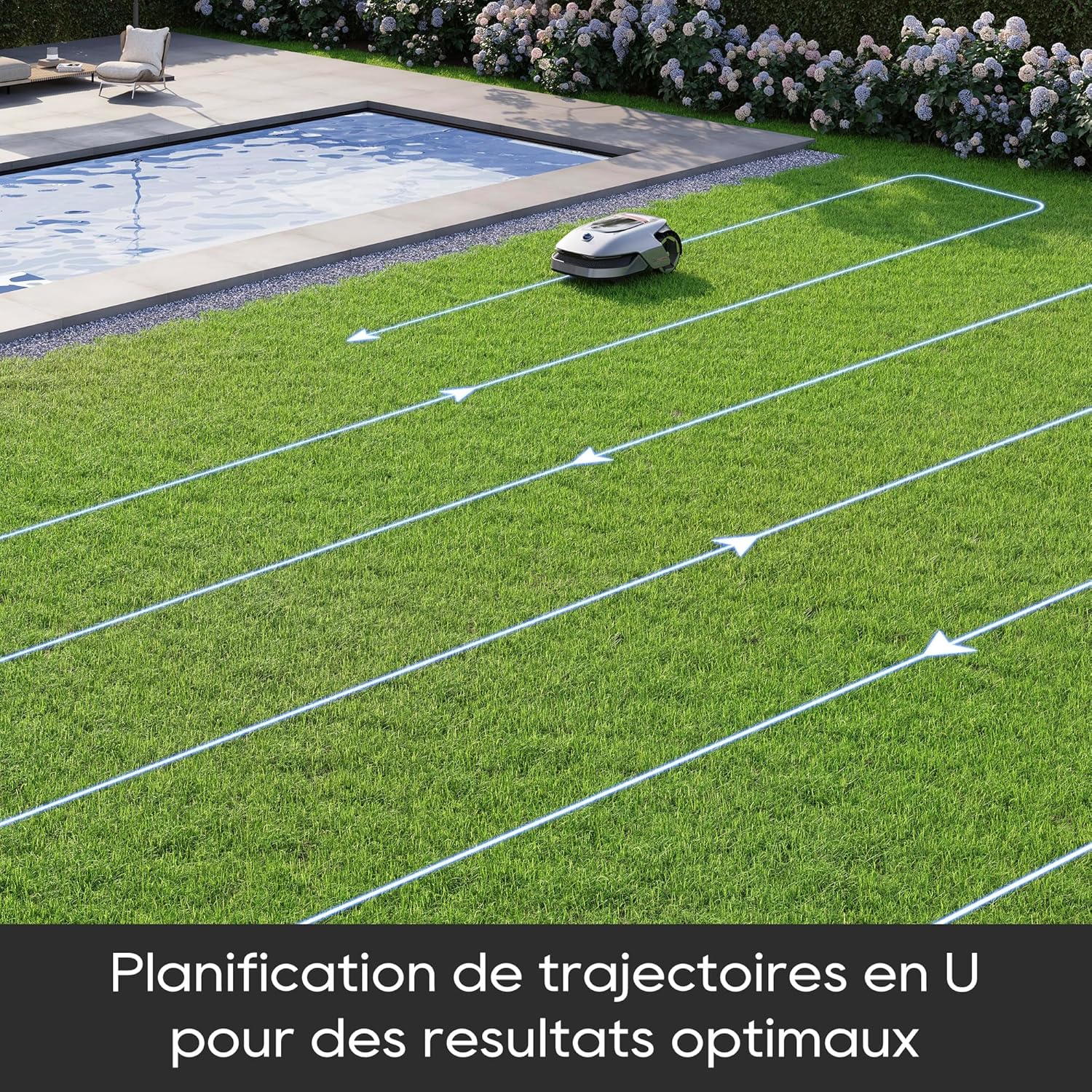 Planification de trajectoires en U pour des résultats optimaux : L’A1 suit une trajectoire en U innovante qui couvre parfaitement votre pelouse, assurant une uniformité et une qualité de coupe remarquables. Des terrains allant jusqu’à 1 000 m² peuvent être entièrement entretenus en seulement 24 heures*.